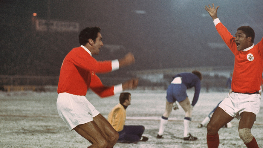 José Torres e Eusébio celebram a vitória do Benfica por 1-3, num relvado do Ajax coberto de neve, em 1969.