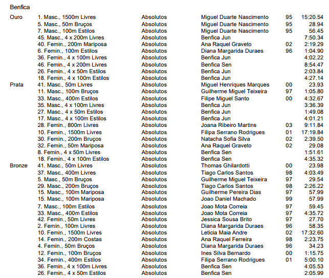 - Benfica Campeão Nacional nos 4x100 estilos - Miguel Nascimento, Guilherme Dias, Guilherme Teixeira, Luiz Pereira