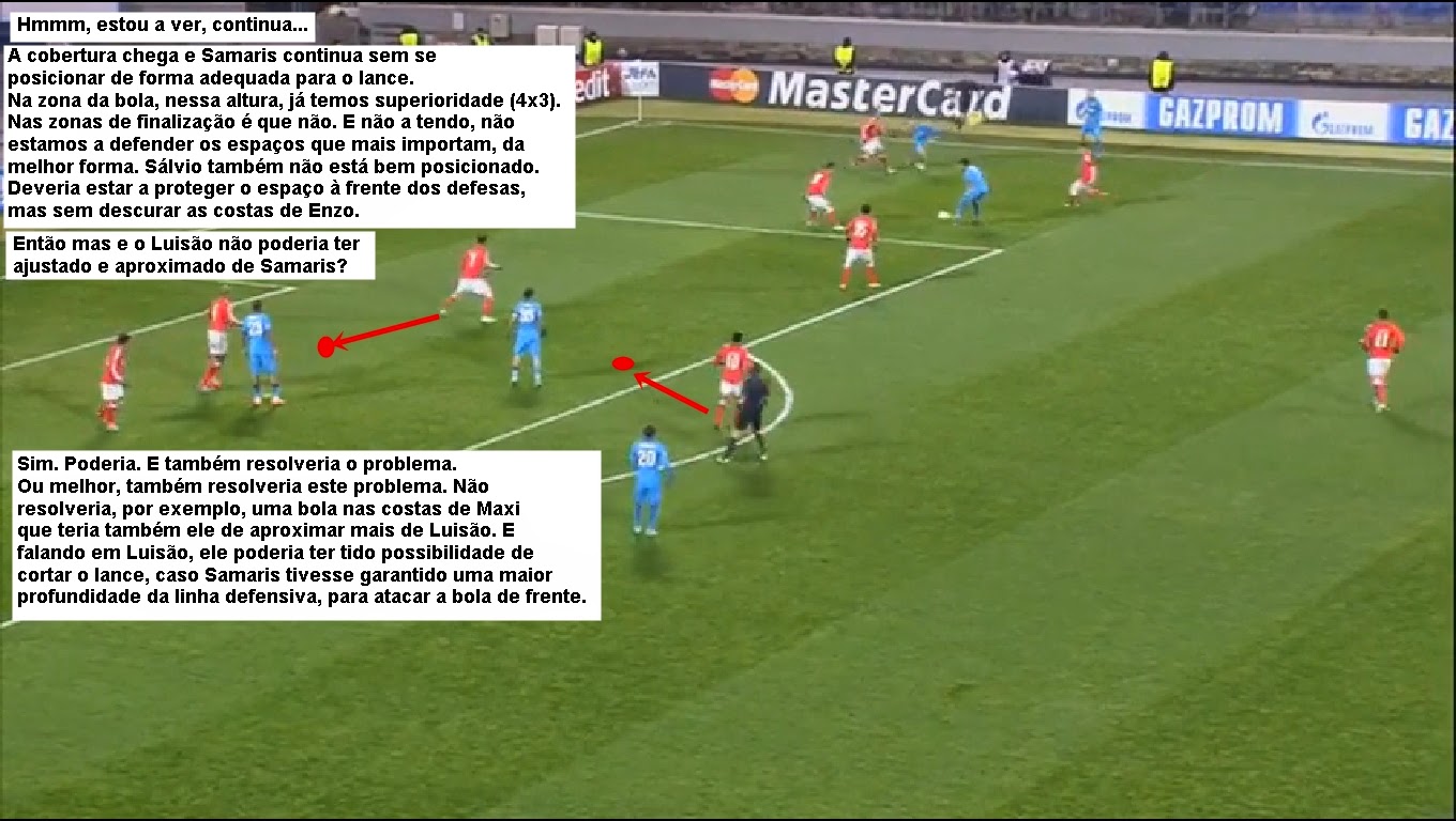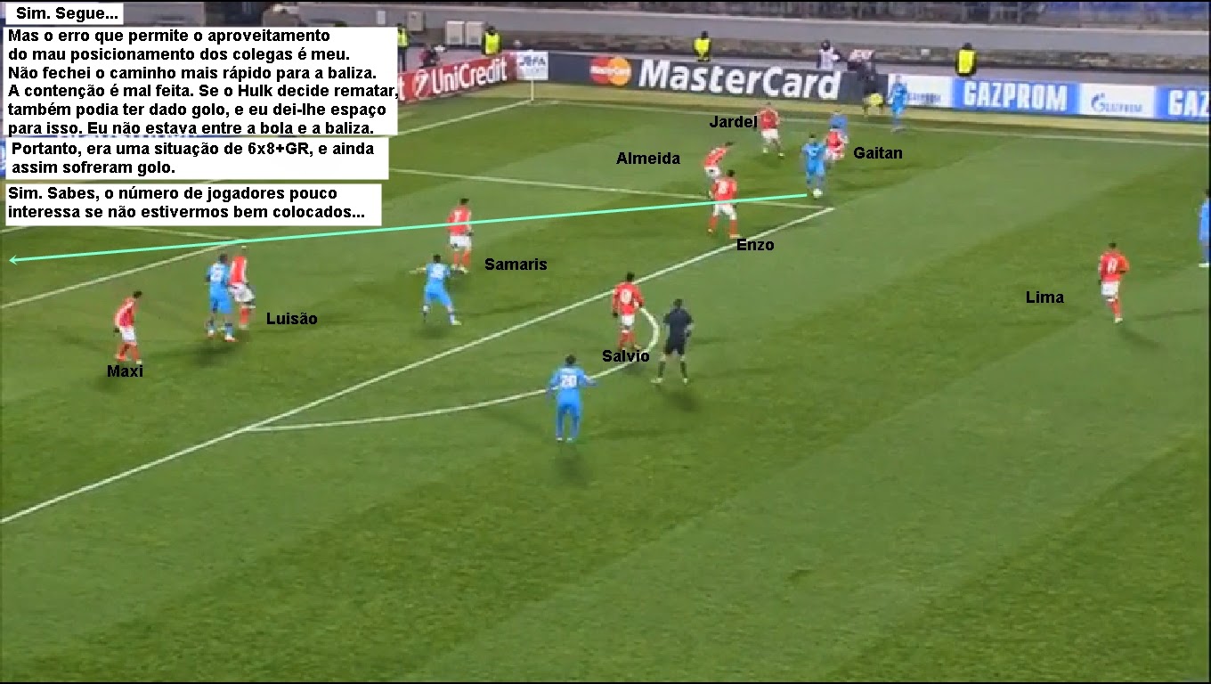O André Almeida está bem posicionado. O movimento mais característico do Hulk é partir para a situação de 1x1 até ao corredor. Ele fechou esse espaço e claro que está entre a bola e a baliza. A linha é aberta pelo mau posicionamento do Enzo que como apoio ao centro de jogo tem de fechar a linha de progressão e não ficar atrás da bola porque o objectivo nº1 é obrigar naquele contexto a equipa contrária a jogar por fora e não por dentro como o seu mau posicionamento originou.