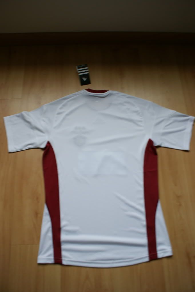 Essa camisa branca tem o mesmo defeito que a principal: o patrocionio com seu quadro preto que suja a camisola.