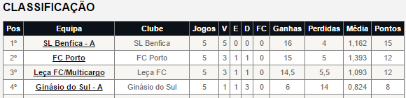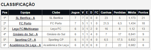 Campeonato Nacional de Bilhar às Três Tabelas: sétima jornada - Ginásio do Sul A 1-3 Benfica A; oitava jornada - Benfica A 4-0 Sporting C.P. A