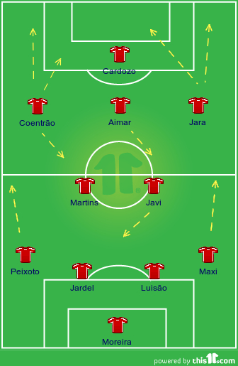 Ora este posicionamento do César, liberta o Coentrão para tarefas atacantes sobre a esquerda, assim como Aimar ao centro e Jara a direita. Notar que ao colocar o Coentrão à esquerda, e com Aimar no onze, ao invés de um Saviola, por exemplo, estou a ganhar mais dois homens para a luta a meio-campo, libertando um veloz Jara para o apoio a Cardozo e na pressão dos defesas adversários.