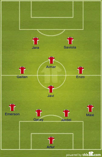 SL Benfica: Artur Moraes, Ruben Amorim, Jardel, Ezequiel Garay, Emerson, Javi García, Pablo Aimar (Axel Witsel [46m]), Nico Gaitán (Enzo Pérez [60m]), Nolito, Javier Saviola, Franco Jara