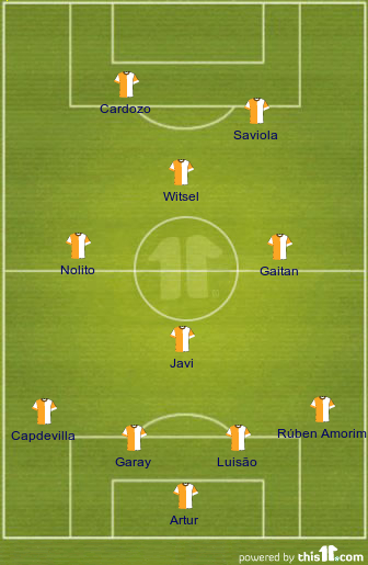 SL Benfica: Artur Moraes, Ruben Amorim, Jardel, Ezequiel Garay, Emerson, Javi García, Pablo Aimar (Axel Witsel [46m]), Nico Gaitán (Enzo Pérez [60m]), Nolito, Javier Saviola, Franco Jara