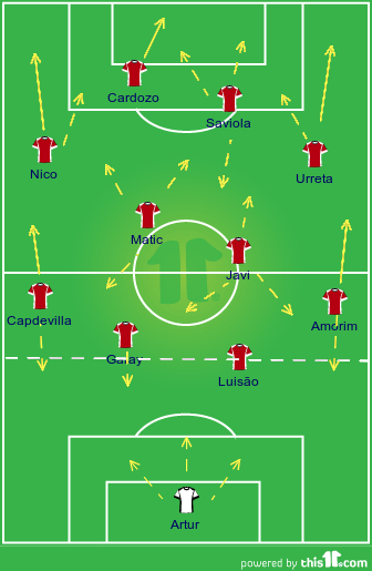 Por fim, tiraria o Aimar (daí dizer que ficaria sem um "10" tradicional) e colocaria o Matic a jogar ao lado do Javi Garcia no centro do terreno. Poderia ter colocado o Witsel, mas como já sei que o belga rende, preferia dar minutos ao Matic, jogando como parceiro do Javi. Para além disso, com Witsel e Saviola, poderia haver uma sobreposição de funções e posições dentro de campo que poderia não render como teoricamente todos esperariamos. Já com Matic e Javi sobre o centro do meio-campo, Nico e Urreta teriam mais liberdade nas alas e Saviola, poderia descer entre-linhas como tanto gosta. Outro factor, talvez muitas vezes dado como pouco importante, mas quanto a mim muito importante, tem a ver com o equilíbrio que uma dupla  de meio-campo formada por um esquerdino e um destro dá em comparação que dois esquerdinos ou dois destros. Isto tem haver com o aumento da diversidade de passes e suas direcções que poderão executar.