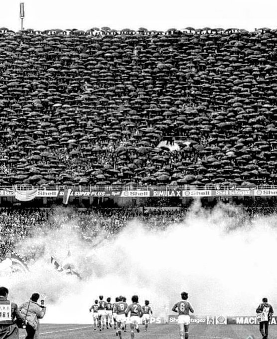 Foto incrivel..muito misticismo com o guarda chuvas! Que tempos aureos, debaixo de chuva, e estadio cheio, sem telemoveis, tudo a remar para o mesmo lado!! Vi muitos jogos assim de chuço aqui no Norte, no Espinho, em que abriam as portas ao intervalo para entrar tudo!! Era demais! :slb2: