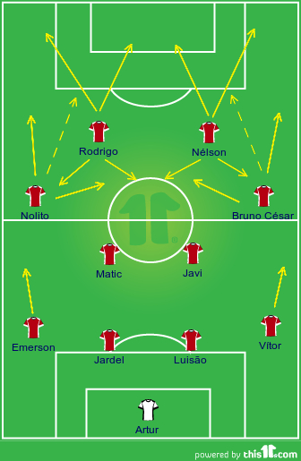 A estratégia é a de atrair o Olhanense para o nosso meio-campo e depois por intermédio de uma esticada por parte de Nolito e Bruno César ou da arrancada de um dos nossos avançados (Nélson e Rodrigo), ou até mesmo num passe longo do meio-campo (Matic) ou defesa (Luisão) para as costas da defesa adversária.