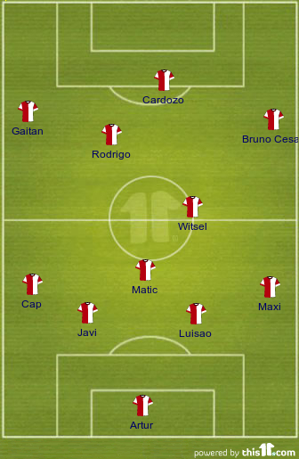 SL Benfica: Artur Moraes, Maxi Pereira, Luisão, Ezequiel Garay, Emerson, Javi García (Nélson Oliveira [62m]), Axel Witsel, Bruno César, Nico Gaitán (Nolito [73m]), Rodrigo (Yannick Djaló [46m]), Óscar Cardozo