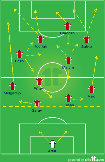 Carlos Martins a jogar mais sobre a direita, poderá servir o Salvio na direita, mas também combinar com o Cardozo para este rematar ou combinar novamente com o CM para este finalizar.