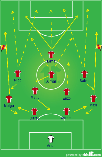 SL Benfica: Artur Moraes, Maxi Pereira, Jardel, Ezequiel Garay, Lorenzo Melgarejo, Nemanja Matić, Enzo Pérez (Pablo Aimar [60m]), Eduardo Salvio, Bruno César (Carlos Martins [46m]), Nico Gaitán (Nolito [75m]), Lima