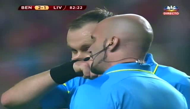 Fui ver o resumo. Acho que o petardo foi lançado quando estava 1-1 e houve a mão que deu o segundo penalty. Quando o Di María protestava. E foi o árbitro de baliza que deu a indicação de grande penalidade.