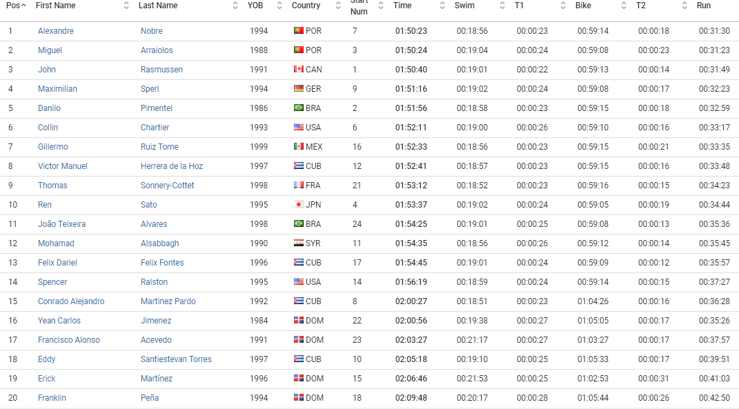 Alexandre Nobre, (169 do ranking mundial), Associação Portugal Talentus, que competiu com o dorsal número 7, venceu a prova com a marca 01:50:23. O triatleta português que tinha conseguido a medalha de prata o ano passado, não só defendeu a posição, mas também a superou, subindo ao primeiro lugar no pódio e alcançando o seu melhor resultado de sempre. Alexandre provou estar num bom momento de forma, inaugurando de forma brilhante a sua época internacional. O triatleta explica-nos a tática de equipa para alcançarem os primeiros lugares: