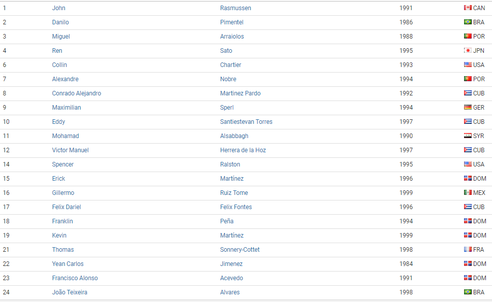 1º Martim Santos; 12º Miguel Ferreira; 15º David Teló; 40º Henrique Silva; 52º Afonso Castelo Ferreira; 72º Diego Sanca