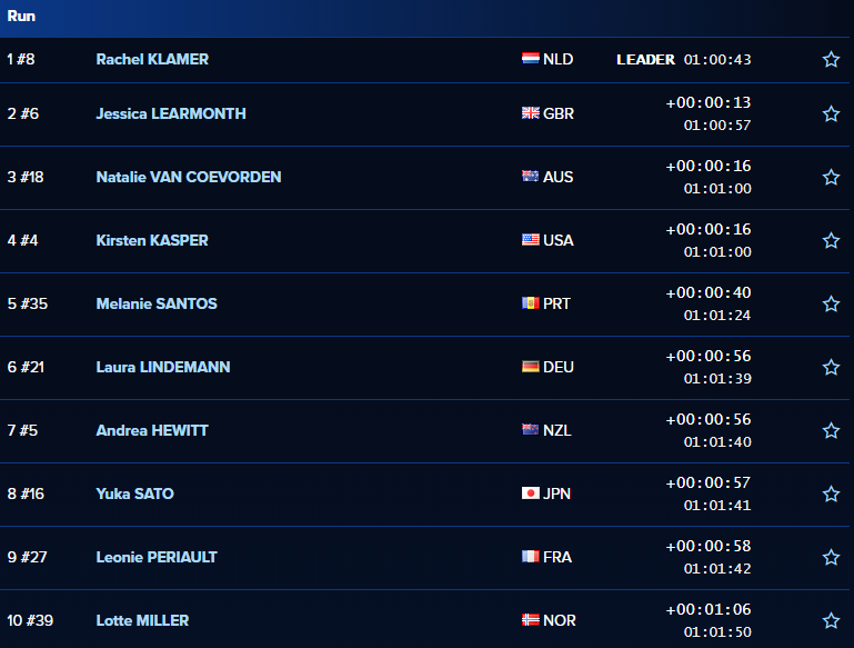 Rachel Klamer, da Holanda, foi a primeira mulher a cortar a meta com o tempo 1:00:43, estreando as suas vitórias em provas WTS.