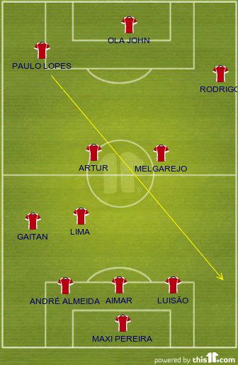 SL Benfica: Artur Moraes, André Almeida, Luisão, Ezequiel Garay, Lorenzo Melgarejo, Roderick Miranda, Carlos Martins (Enzo Pérez [64m]), Ola John (Lima [74m]), Nico Gaitán, Rodrigo, Óscar Cardozo (Eduardo Salvio [64m])