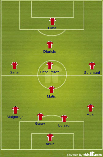 SL Benfica: Artur Moraes, Maxi Pereira (Miralem Sulejmani [85m]), Luisão, Ezequiel Garay, Bruno Cortez, Nemanja Matić, Ruben Amorim (Ola John [46m]), Enzo Pérez, Nico Gaitán, Filip Đuričić (Rodrigo [46m]), Lima
