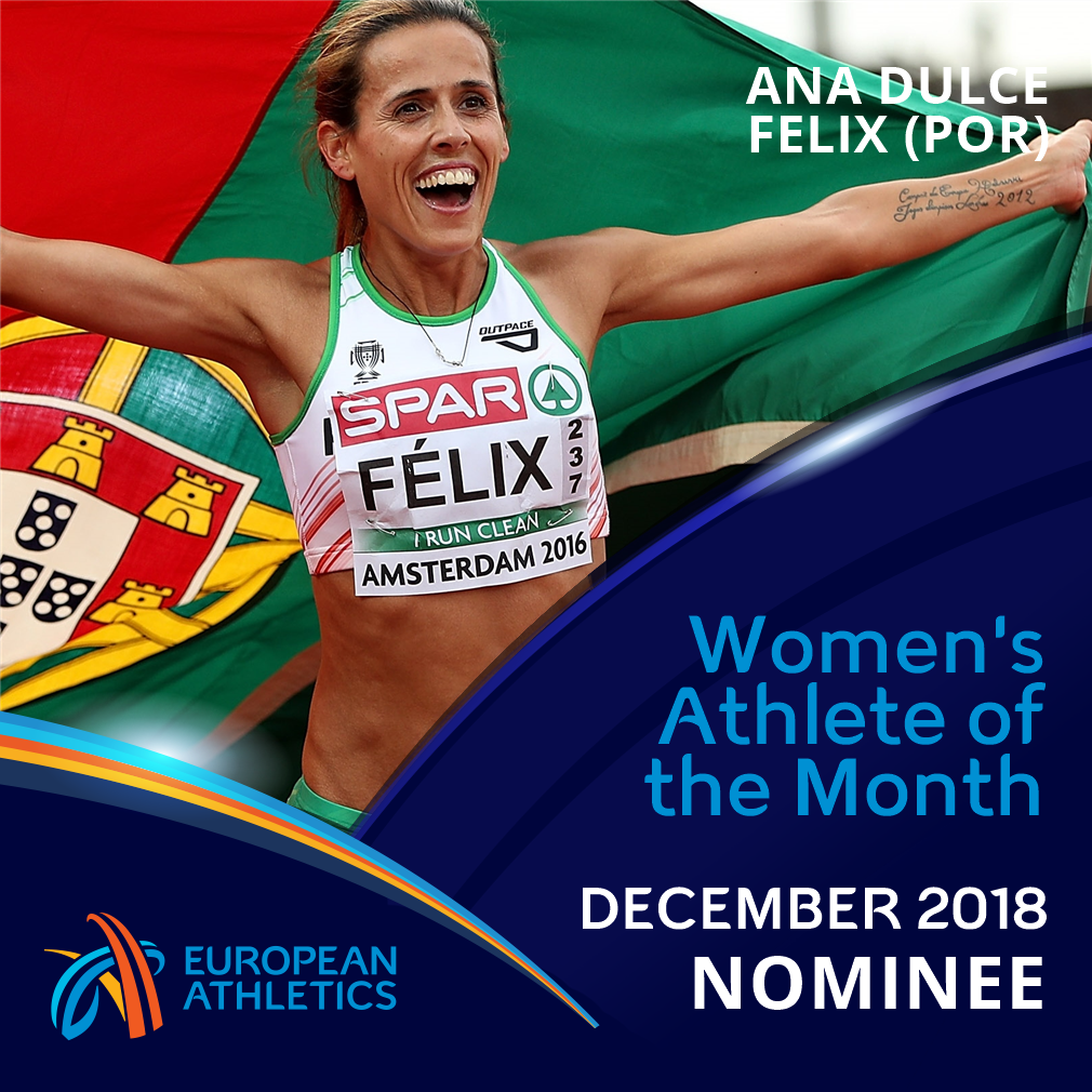 Voting has taken place across European Athletics' Facebook, Twitter and Instagram since Thursday and Felix decisively topped the women's voting with 5123 votes across the three platforms ahead of Italy's European U20 cross country champion Nadia Battocletti with 3793 votes and European high jump champion Mariya Lasitskene with 2091 votes.
