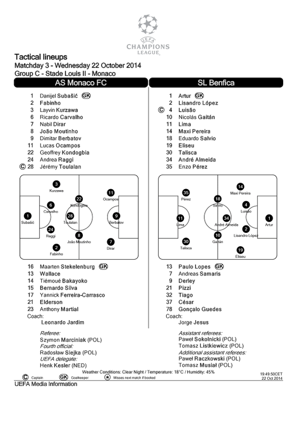 AS Monaco: Subasic, Fabinho, Ricardo Carvalho, Raggi, Kurzawa, Toulalan, João Moutinho, Kondogbia, Dirar, Ocampos, Berbatov
