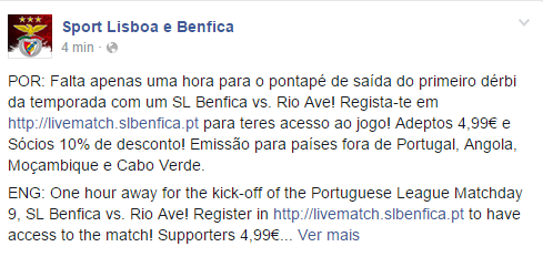 POR: Falta apenas uma hora para o pontapé de saída do primeiro dérbi da temporada com um SL Benfica vs. Rio Ave! Regista-te em http://livematch.slbenfica.pt para teres acesso ao jogo! Adeptos 4,99€ e Sócios 10% de desconto! Emissão para países fora de Portugal, Angola, Moçambique e Cabo Verde.