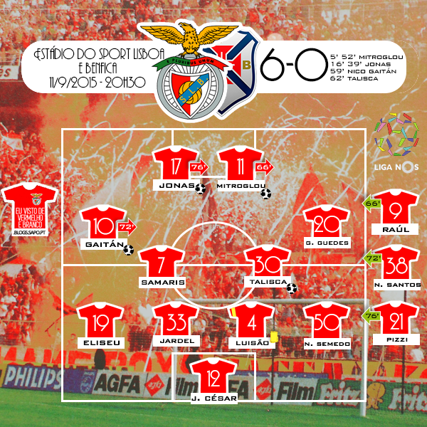 SL Benfica: Júlio César, Nélson Semedo, Luisão, Jardel, Eliseu, Andreas Samaris, Anderson Talisca, Gonçalo Guedes, Nico Gaitán (Nuno Santos [72m]), Jonas (Pizzi [78m]), Kostas Mitroglou (Raúl Jiménez [66m])