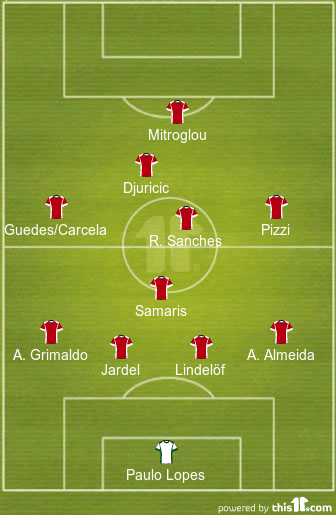 Ederson; Semedo, Lindelöf, Lisandro, Grimaldo; Samaris, Talisca, Guedes, Carcela; Djuricic, Raul.