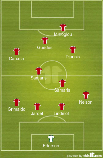 Ederson; Semedo, Lindelof, Lisandro e Grimaldo; Samaris, Talisca, Djuricic e Carcela; Mitro e Guedes.