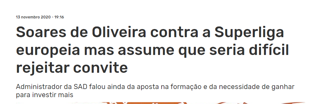 A minha posição é simples, sou contra qualquer superliga europeia em qualquer molde. Os clubes menores dignificam a competição como qualquer outro e alimentam paixões de igual forma.