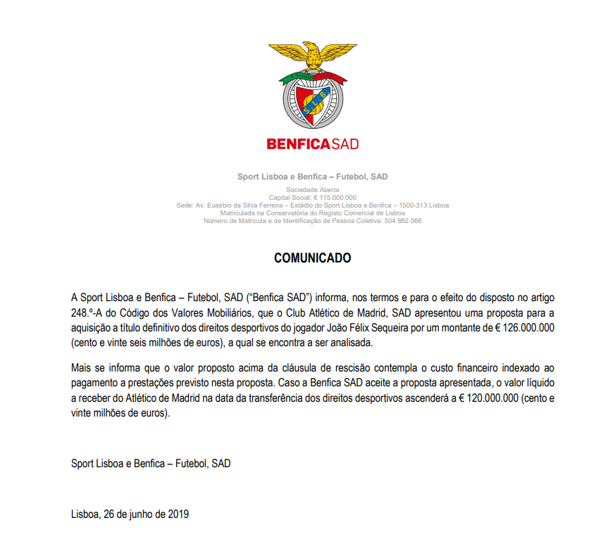 Caso a Benfica SAD aceite a proposta apresentada, o valor líquido a receber do Atlético de Madrid na data da transferência dos direitos desportivos ascenderá a € 120.000.000 (cento e vinte milhões de euros).