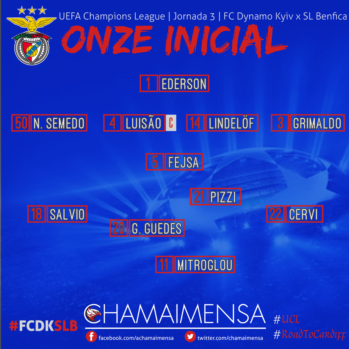 XI: Ederson, Nélson Semedo, Luisão, Lindelöf, Grimaldo, Fejsa, Pizzi, Cervi, Salvio, Gonçalo Guedes, Mitroglou. #slblive