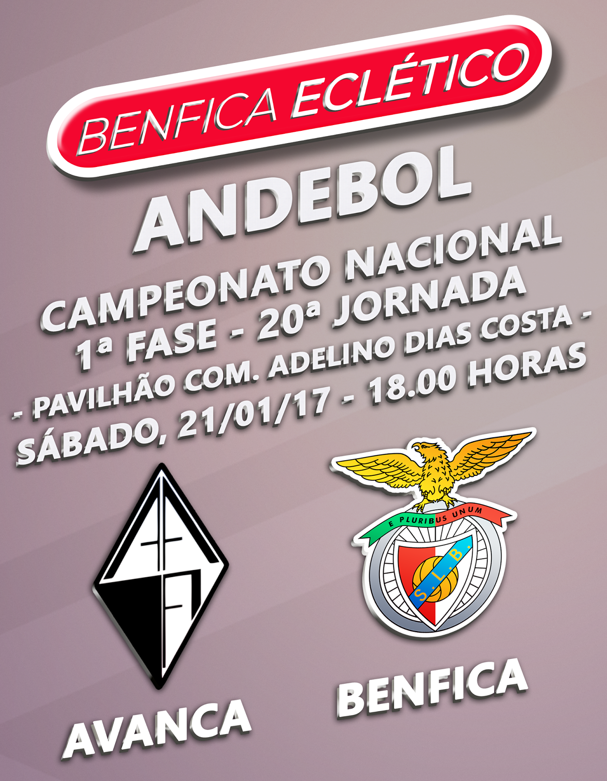 No sábado, dia 21 de janeiro, o Benfica desloca-se ao terreno do AA Avanca em jogo a contar para a 20.ª jornada da fase regular do Campeonato. O adversário, da Associação de Andebol de Aveiro, ocupa a 6.ª posição e na última jornada perdeu, fora, diante do Maia/ISMAI, por 30-27.