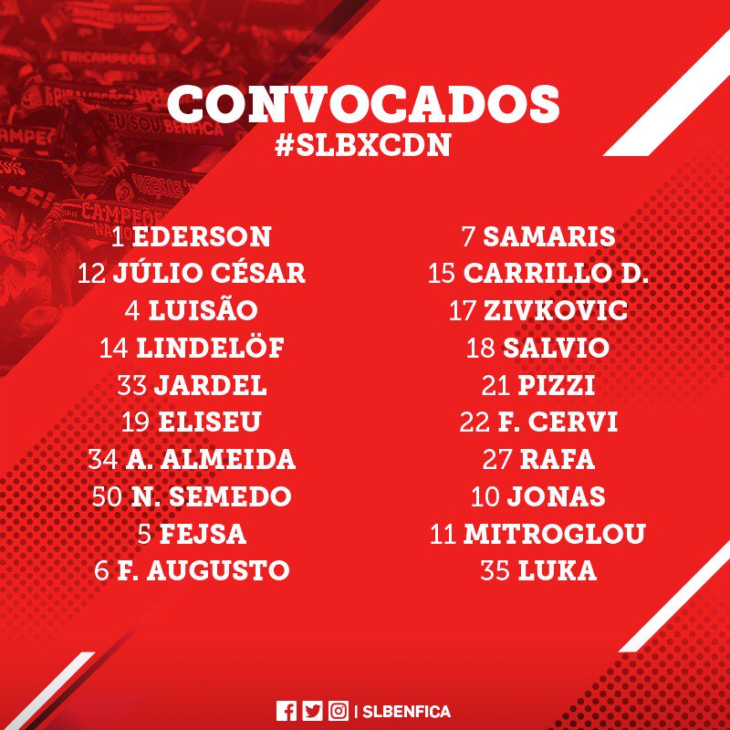 Defesas: Luisão, Lindelöf, Jardel, Eliseu, A. Almeida, N. Semedo;
