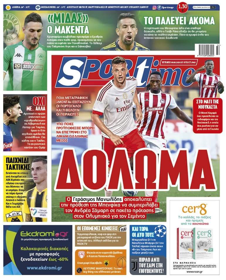 Segundo vi no twitter, esta capa, de hoje, diz que o Benfica oferece o Samaris e dinheiro para ter o Rúben Semedo.