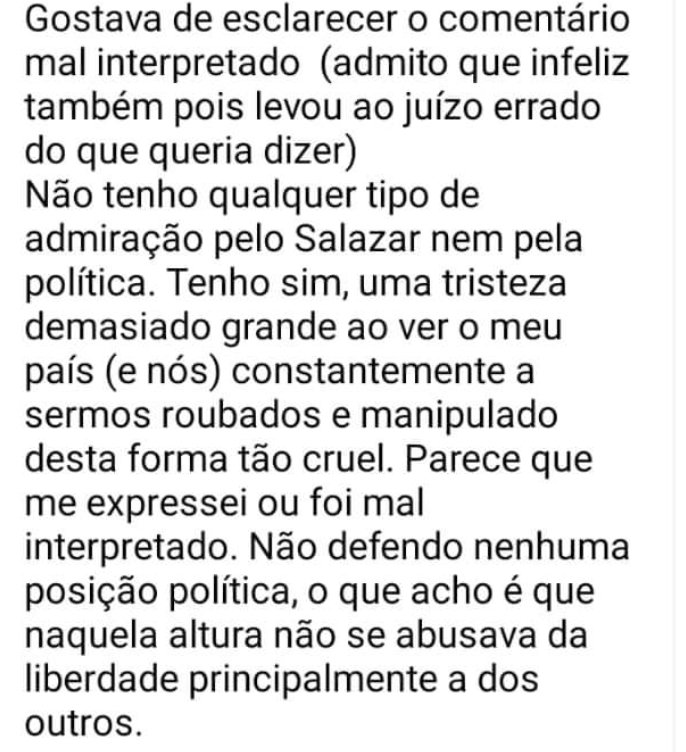também acho que é mais ignorãncia do que opinião politica. Ele deve achar que no tempo do salazar havia mais respeito e as pessoas eram mais corretas como a cartilha de muito velhote de direita quer fazer passar. No fundo se calhar até é verdade. O pessoal tinha tanto medo de ser preso que até se abstinha de fazer asneiras.
