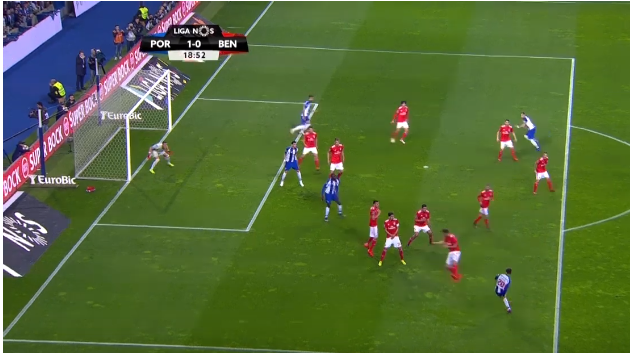 Não dá porque está exactamente tapada pelo corpo do jogador do Porto, porque está a sair do pé.