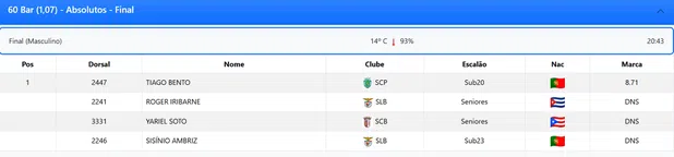 O Benfica protestou a prova formalmente junto do juiz de apelo da Associação de Atletismo de Lisboa, considerando terem sido infringidos os artigos 16 e 18 do regulamento internacional da World Athletics, e aguarda pelos desenvolvimentos do caso nas próximas horas. Certo é que, ao dia de hoje, são Tatjana Pinto e Lorène Bazolo, atletas do Sporting, as velocistas apuradas para representar Portugal na Polónia na categoria dos 60 metros femininos.