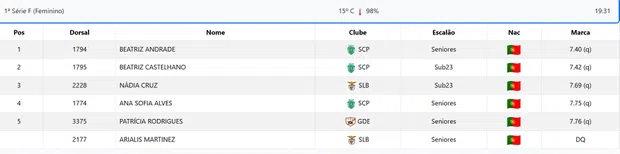 Os resultados da 1.ª série feminina no Velociti Jamor, com a desqualificação de Arialis Martínez