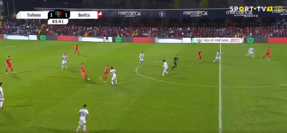 Aqui o AA é o jogador que aparece no frame. Os dois defesas do Trofense não aparecem. Estão mais adiantados. Se virem o lance a partir daqui percebem que eles já lá estavam, ou pelo menos um deles, até pelo adiantado da sombra do gajo mais ao meio, que essencialmente é o que fica a dormir. Curiosamente, noutra repetição, parece ser o gajo mais chegado à linha a colocar o AA em jogo...