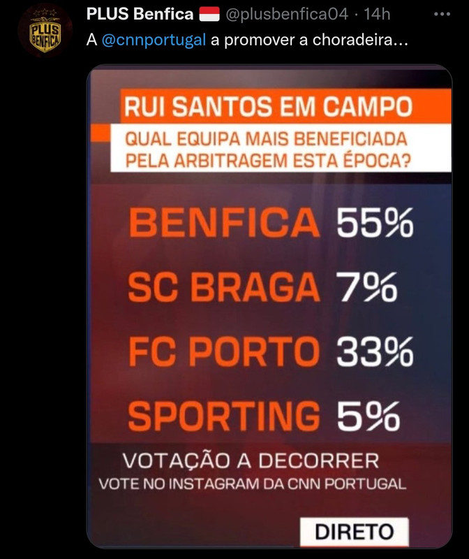 O Benfica a equipa mais prejudicada, e a que tem mais adeptos, aparece nessa sondagem como a mais beneficiada. É inacreditável o que se passa com a comunicação social e onde a comunicação do Benfica deixa muito a desejar.