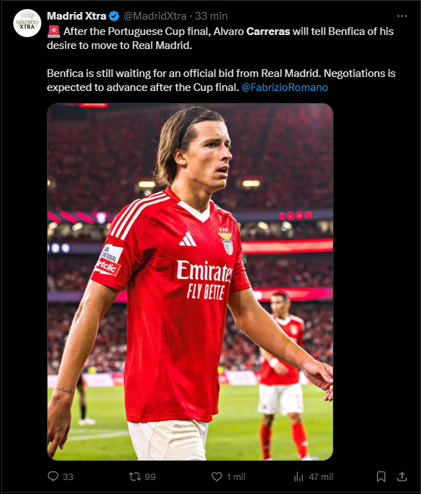 Os espanhois dizem que tem uma alínea no contrato que diz que só o Benfica pode negociar a venda do jogador e que o Real já estava a negociar diretamente com o Benfica