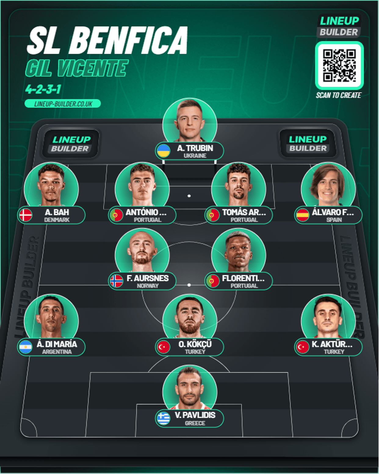 SL Benfica: Anatoliy Trubin, Tomás Araújo, António Silva, Nicolás Otamendi, Álvaro Carreras (Gianluca Prestianni [90+3m]), Florentino Luís, Fredrik Aursnes, Orkun Kökçü (Zeki Amdouni [67m]), Ángel Di María (Jan-Niklas Beste [75m]), Kerem Aktürkoğlu (Benjamín Rollheiser [67m]), Vangelis Pavlidis (Arthur Cabral [67m])